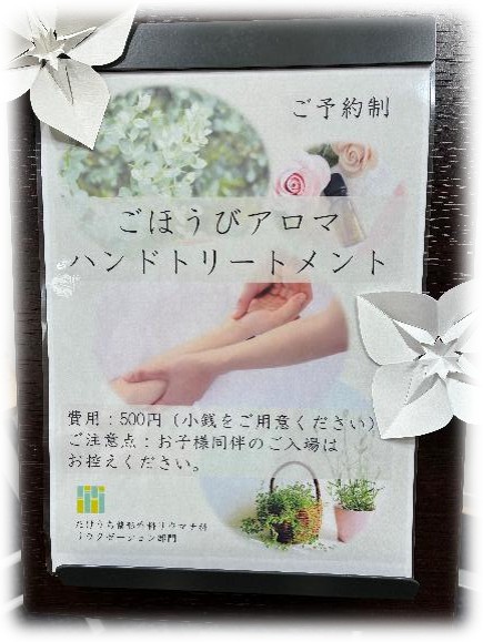 そんな中、私たちのブース「たけうち整形外科リウマチ科リラックス部門」によるハンドアロマトリートメントへは、「これ狙いできました♪」とか、「一度アロマトリートメントを受けてみたかったんです」とか・・・雨が降ってても当ブースのイベントを楽しみにして下さっていた方々がお越しくださり、そのお気持ちだけでもスタッフ一同感動&幸せになりました。本当にありがとうございます。