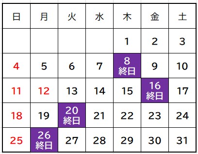 1月は以下のスケジュールでアロマハンドトリートメントのご予約を受け付けています。